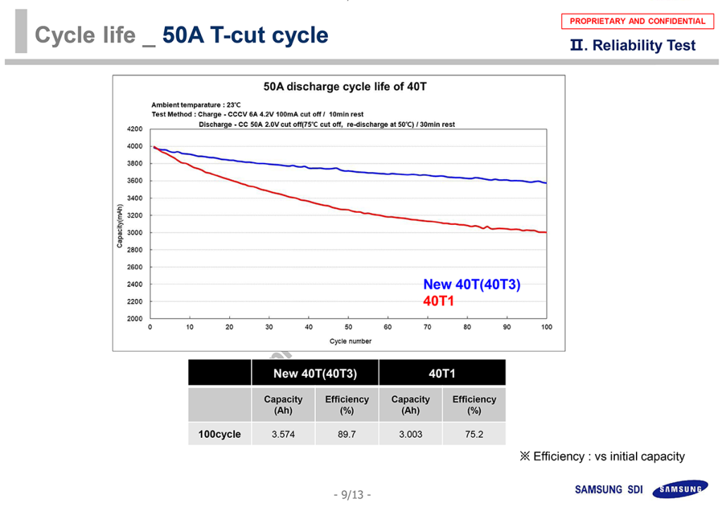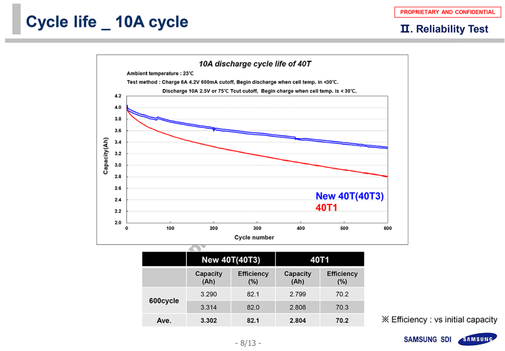 Становится ясно, что производитель немного ухудшил некоторые параметры аккумулятора в угоду увеличения срока его службы. Деградация и уменьшение емкость у аккумуляторов Samsung 40T третьей версии происходит значительно медленнее. В конечном итоге, они должны прослужить дольше по сравнению с аккумуляторами первой версии. Для увеличения срока службы аккумулятора пришлось пожертвовать в первую очередь внутренним сопротивлением. По нашему мнению – это вполне оправдано.