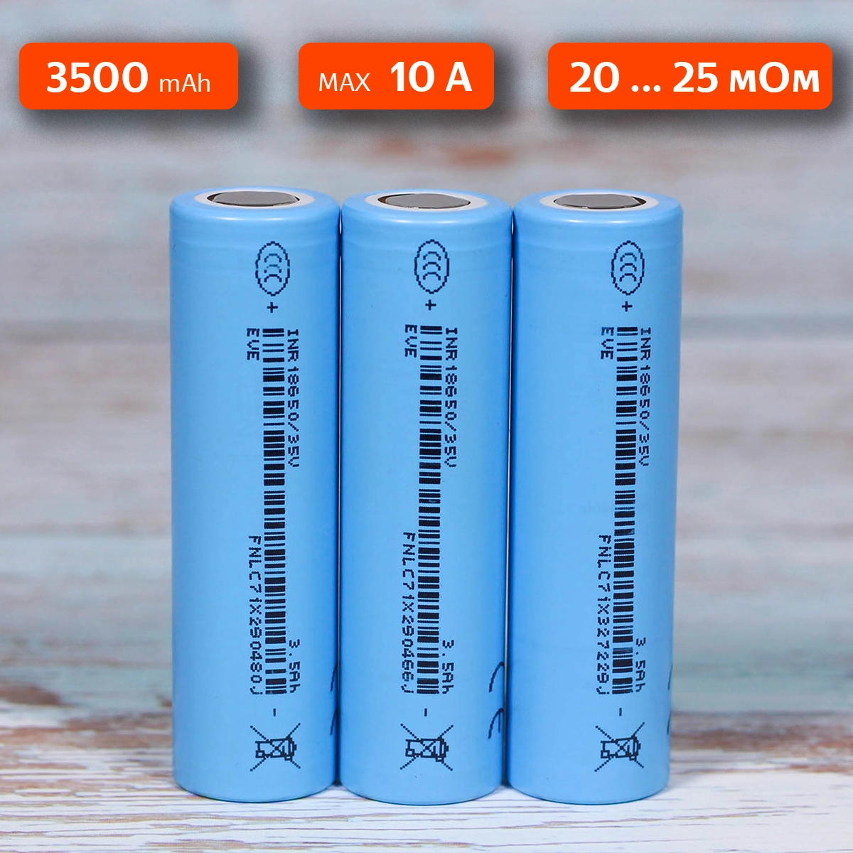 EVE INR18650/35V - бюджетный аккумулятор 18650 высокой емкости. Емкость аккумулятора 3500 mAh, максимальный ток 10 Ампер. Аккумуляторы EVE INR18650/35V - используются в устройствах, где мощность невысокая и требуется максимальная емкость для увеличения времени автономной работы. Это ручные и налобный фонари, powerbank, батареи электротранспорта невысокой мощности и другие устройства.
