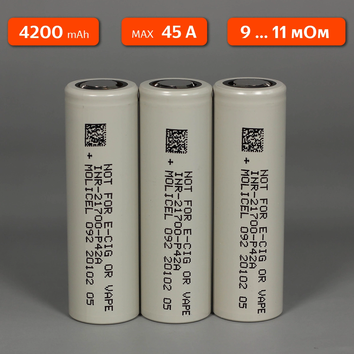 Molicel INR21700-P42A - мощный высокотоковый аккумулятор формата 21700. Номинальная емкость - 4200mAh, максимальный ток - 45 Ампер. Эта модель может работать при низких температурах, вплоть до -40 градусов. Аккумулятор Molicel INR21700-P42A подойдет для устройств, где требуются мощные аккумуляторы формата 21700. Это, например, батареи мощного аккумуляторного электроинструмента.